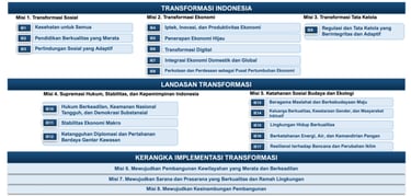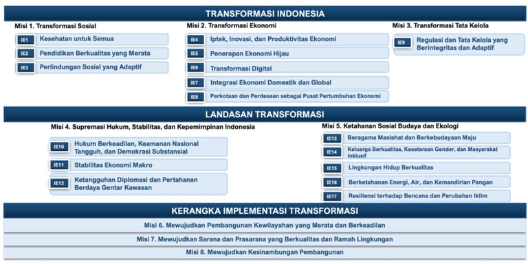 Transformasi Ekonomi: Tingkatkan produktivitas melalui iptek, inovasi, ekonomi produktif (manufaktur, keuangan, pertanian, ekonomi biru, pariwisata, kreatif, UMKM, tenaga kerja, BUMN), ekonomi hijau, digitalisasi, integrasi domestik-global, serta pembangunan perkotaan dan perdesaan.