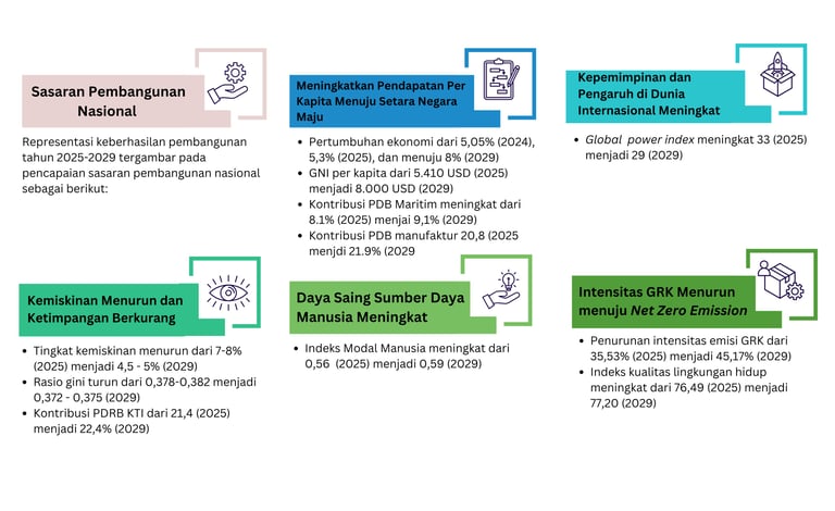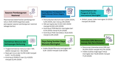 Pendapatan Setara Negara Maju: Menargetkan pendapatan per kapita mencapai USD 23.000 – 30.300, menjadikan Indonesia kekuatan ekonomi ke-5 terbesar di dunia. Sasaran ini didukung oleh peningkatan kontribusi PDB industri pengolahan hingga 28% dan PDB maritim sebesar 15%.